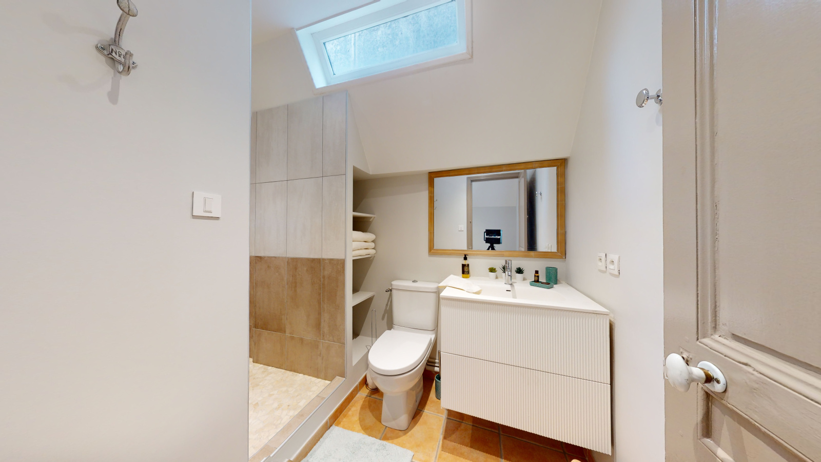 La villa possède, 3 chambres, 2 salles de bains et un garage à 50 mètres.