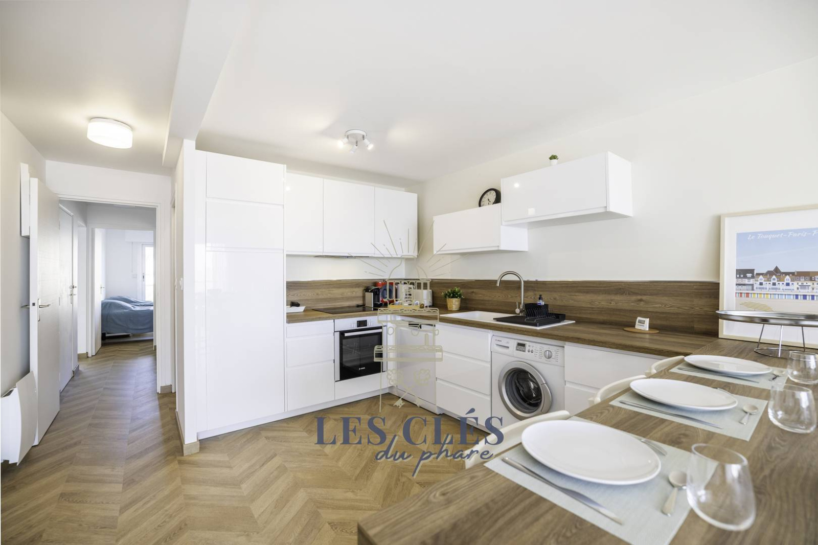 Grande cuisine ouverte sur le salon avec cafetière filtre et cafetière Nespreso.