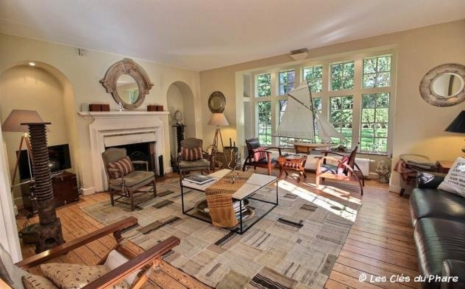 Salle à manger avec cheminée ouverte sur un grand salon.