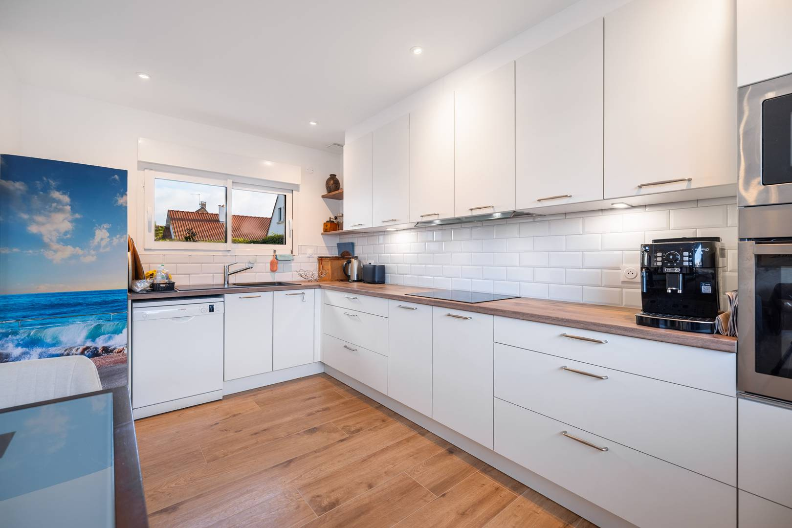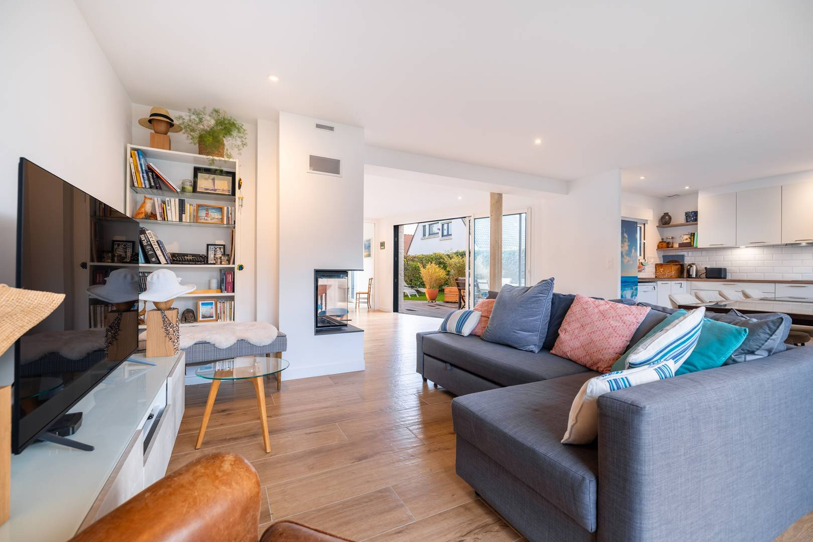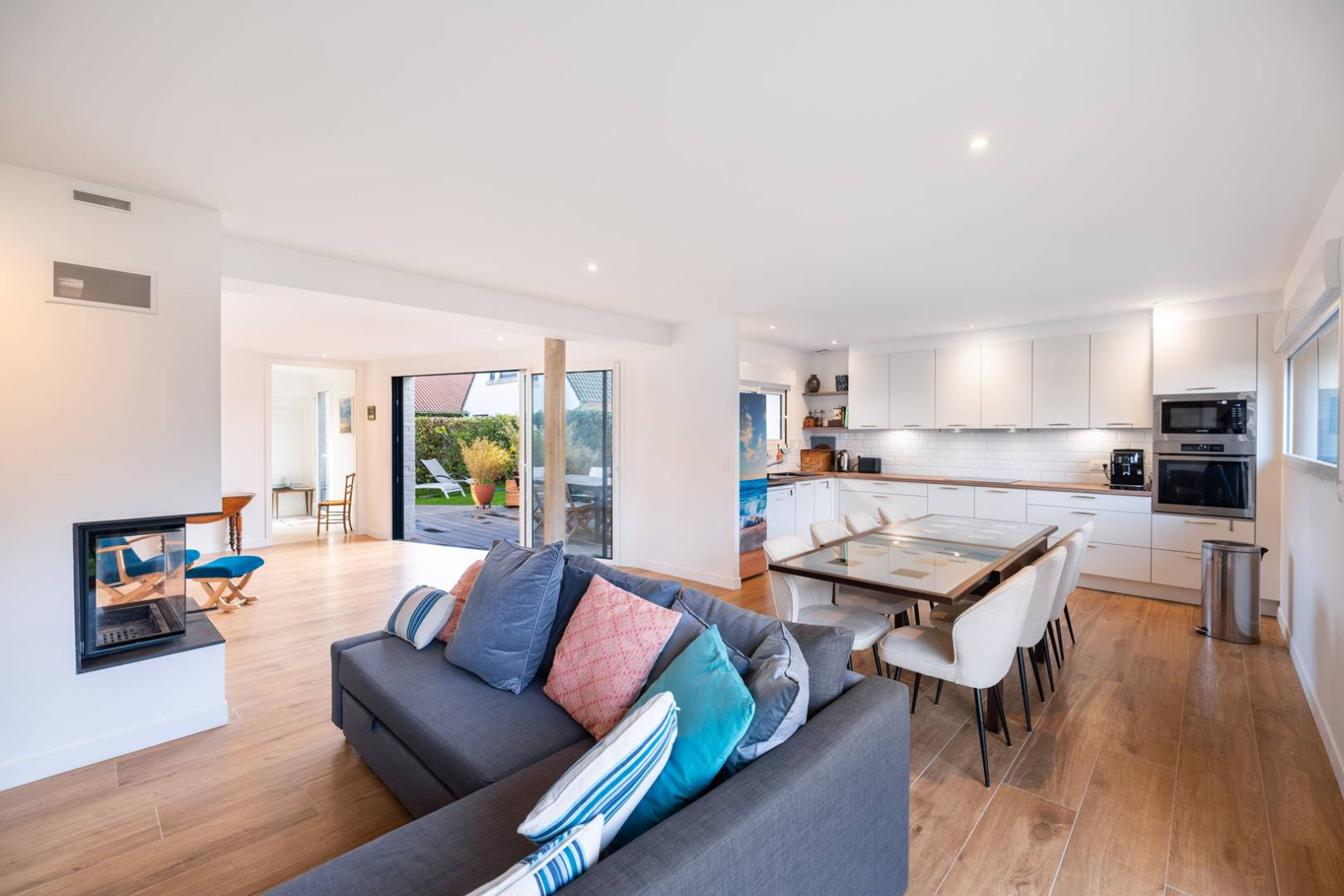 Cuisine équipée ouverte sur le salon.