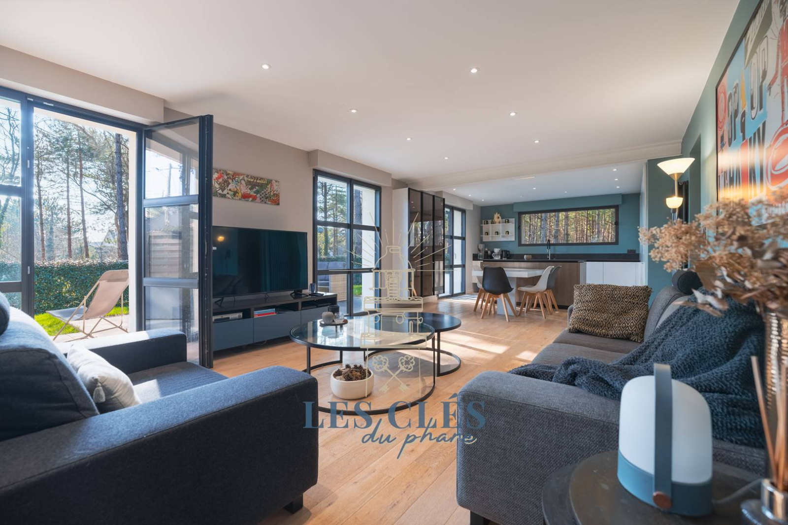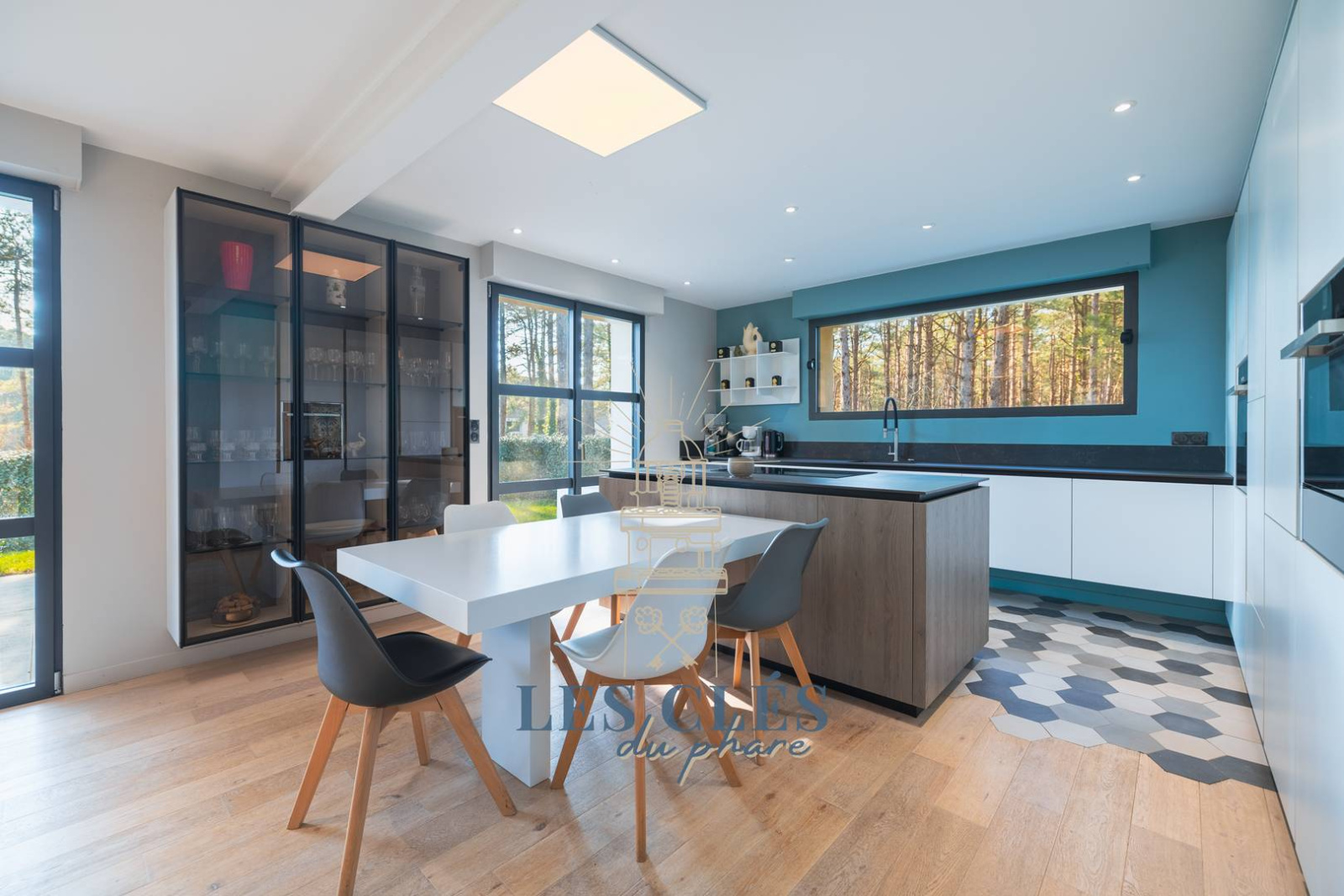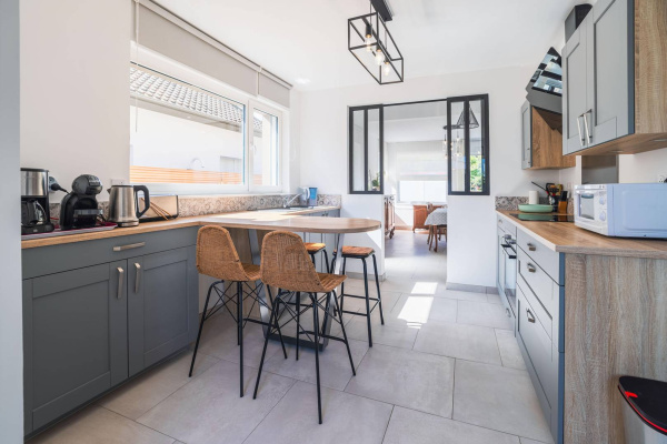 Grande cuisine équipée ouverte sur le séjour avec cafetière filtre et cafetière Nespresso.
