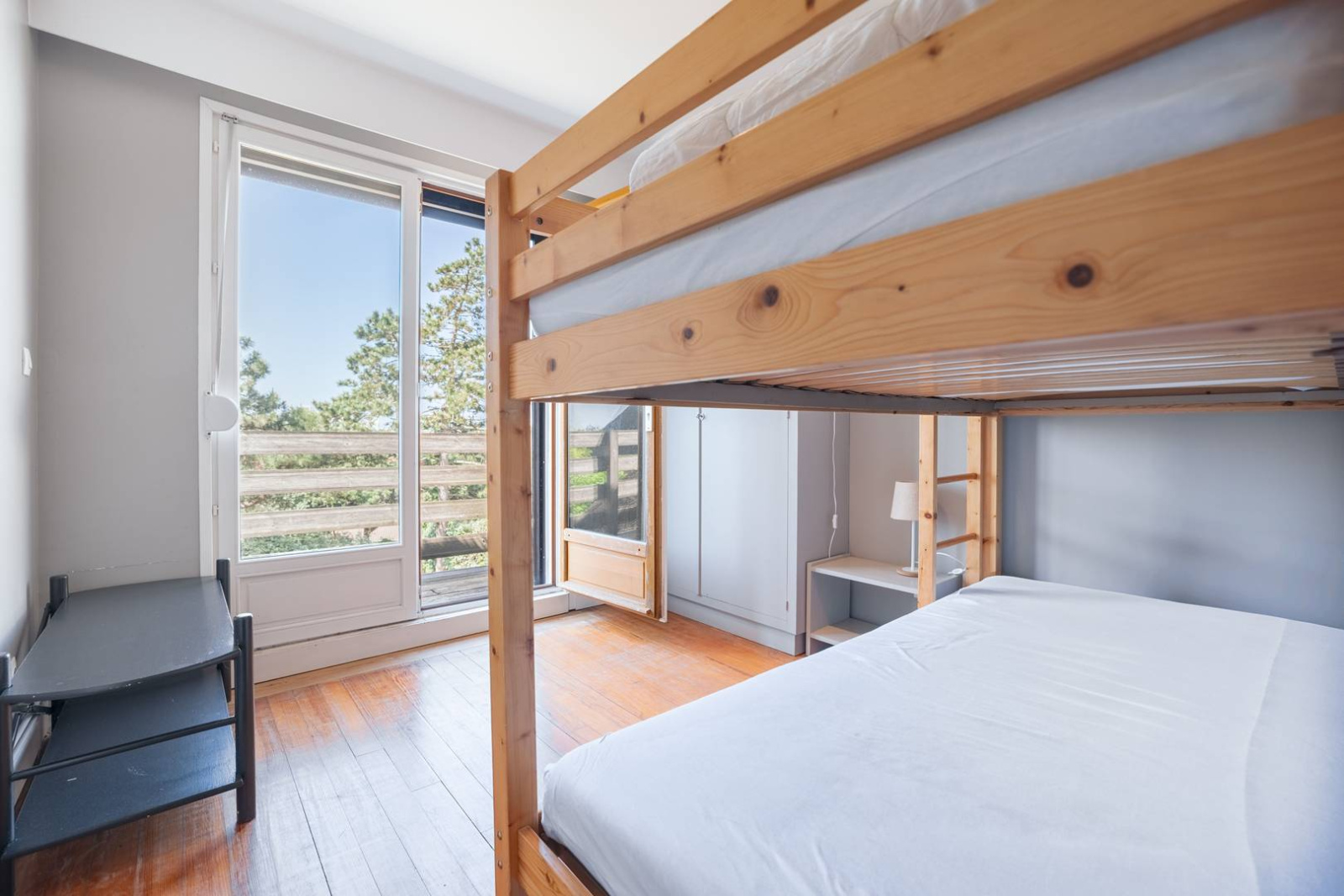 1 Chambre avec lit superposé et placard avec accès balcon.
