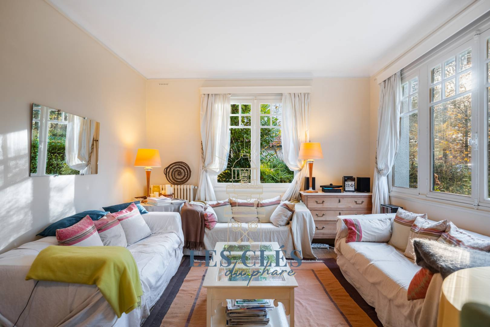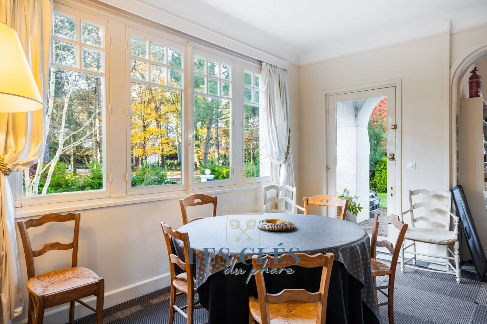 Entrée, séjour avec cheminée et coin bureau.