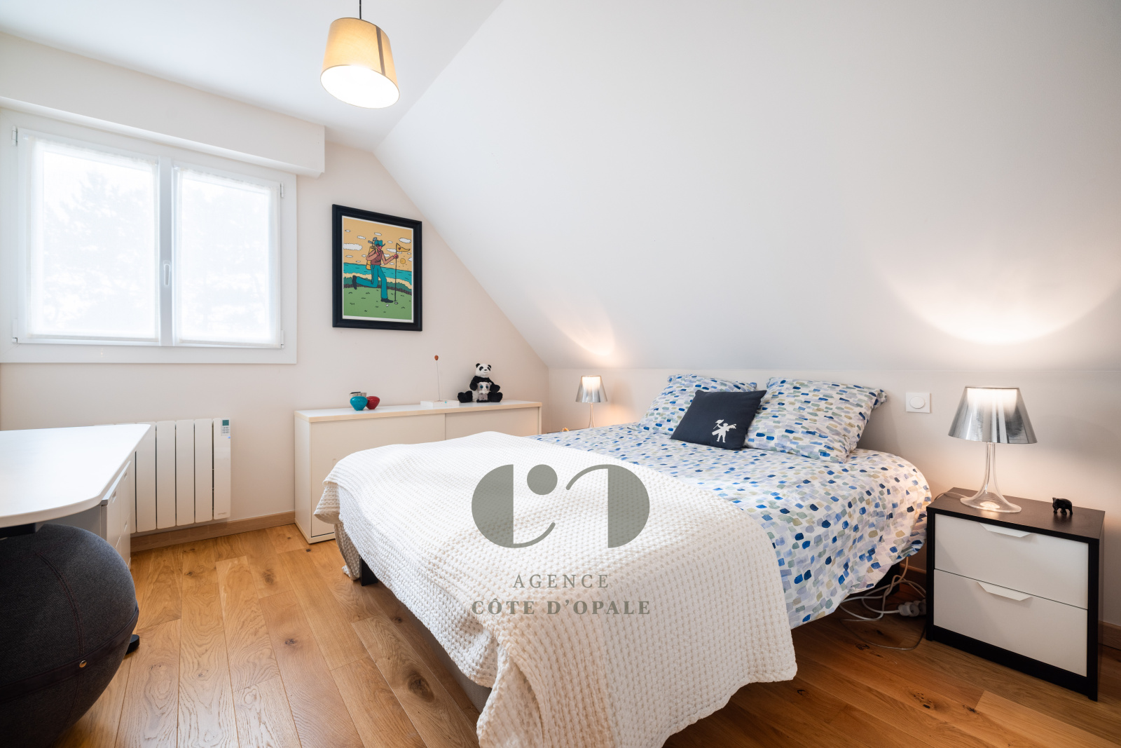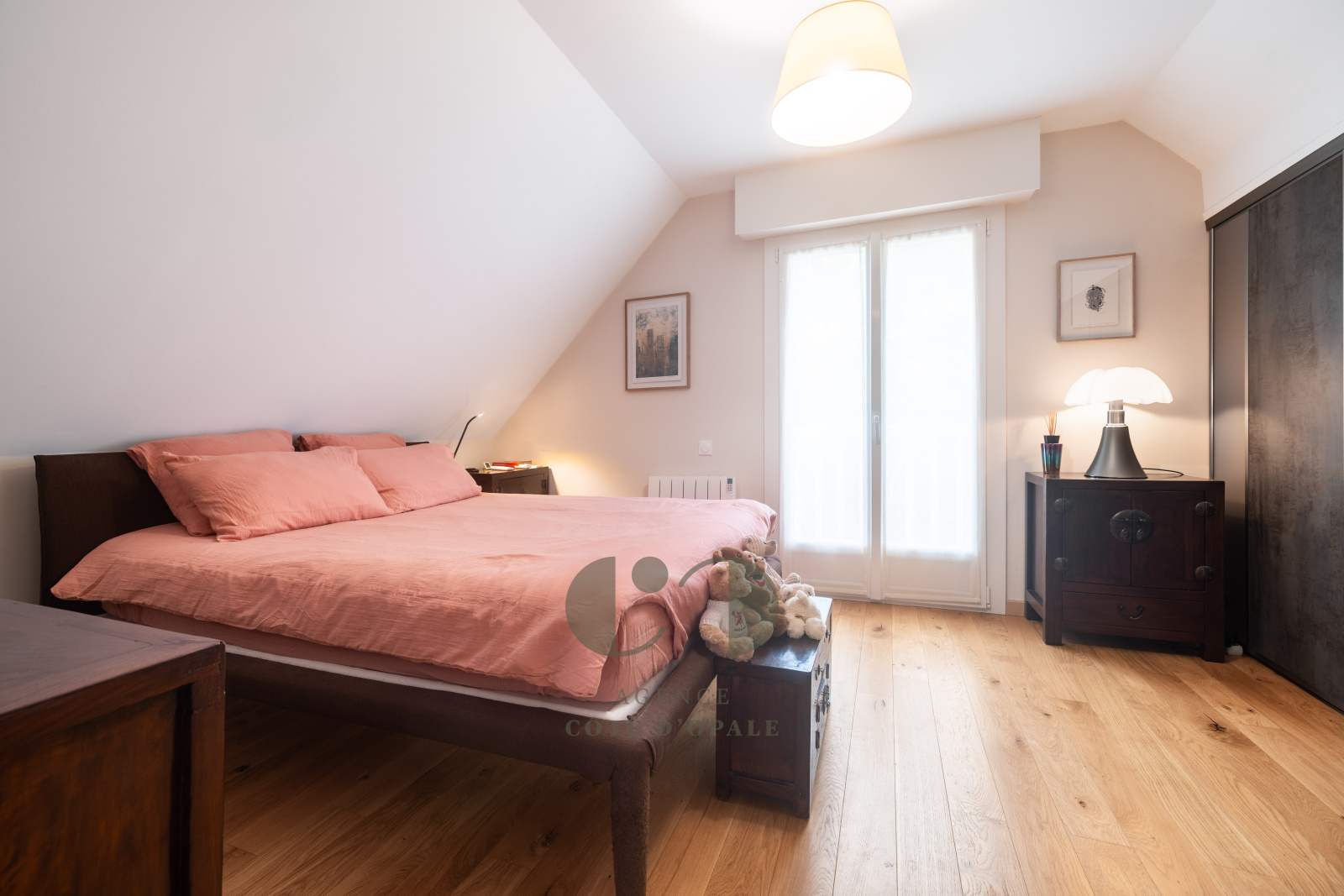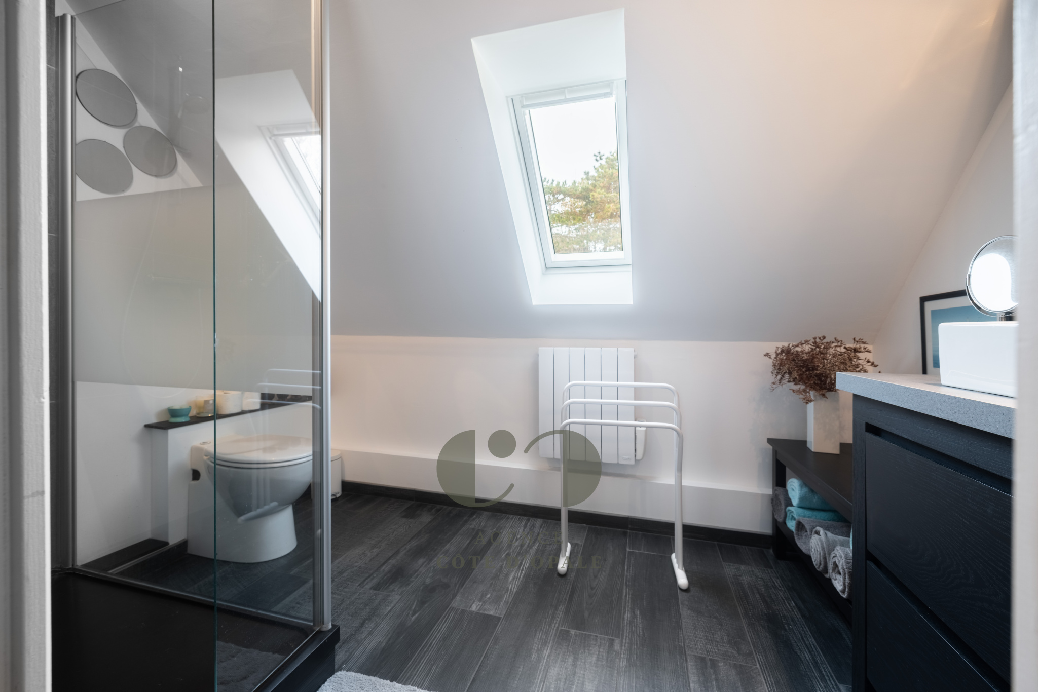 À l’étage, l’espace nuit propose trois chambres, deux salles d’eau et un WC indépendant.