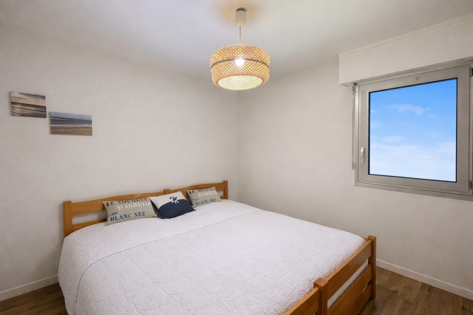 Le séjour ouvre sur une terrasse sans vis-à-vis bénéficiant d’une vue mer latérale. La distribution est fonctionnelle avec deux chambres pouvant chacune recevoir un lit double, une salle d’eau indépendante et des WC séparés.