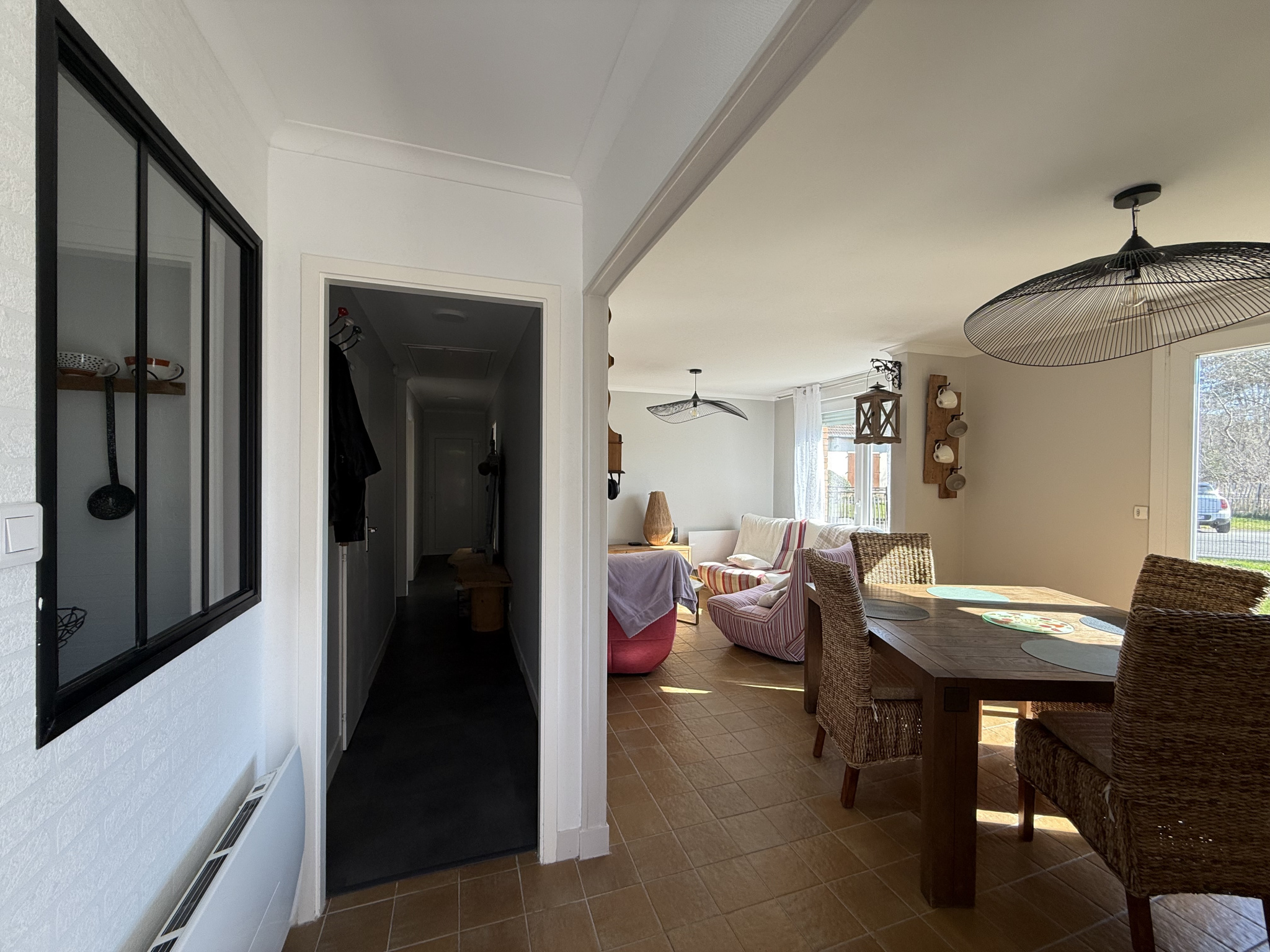 Récemment rénovée, elle offre un intérieur fonctionnel comprenant deux chambres, une salle d’eau avec coin dressing, WC séparés, une cuisine équipée indépendante, ainsi qu’un cellier et un garage.